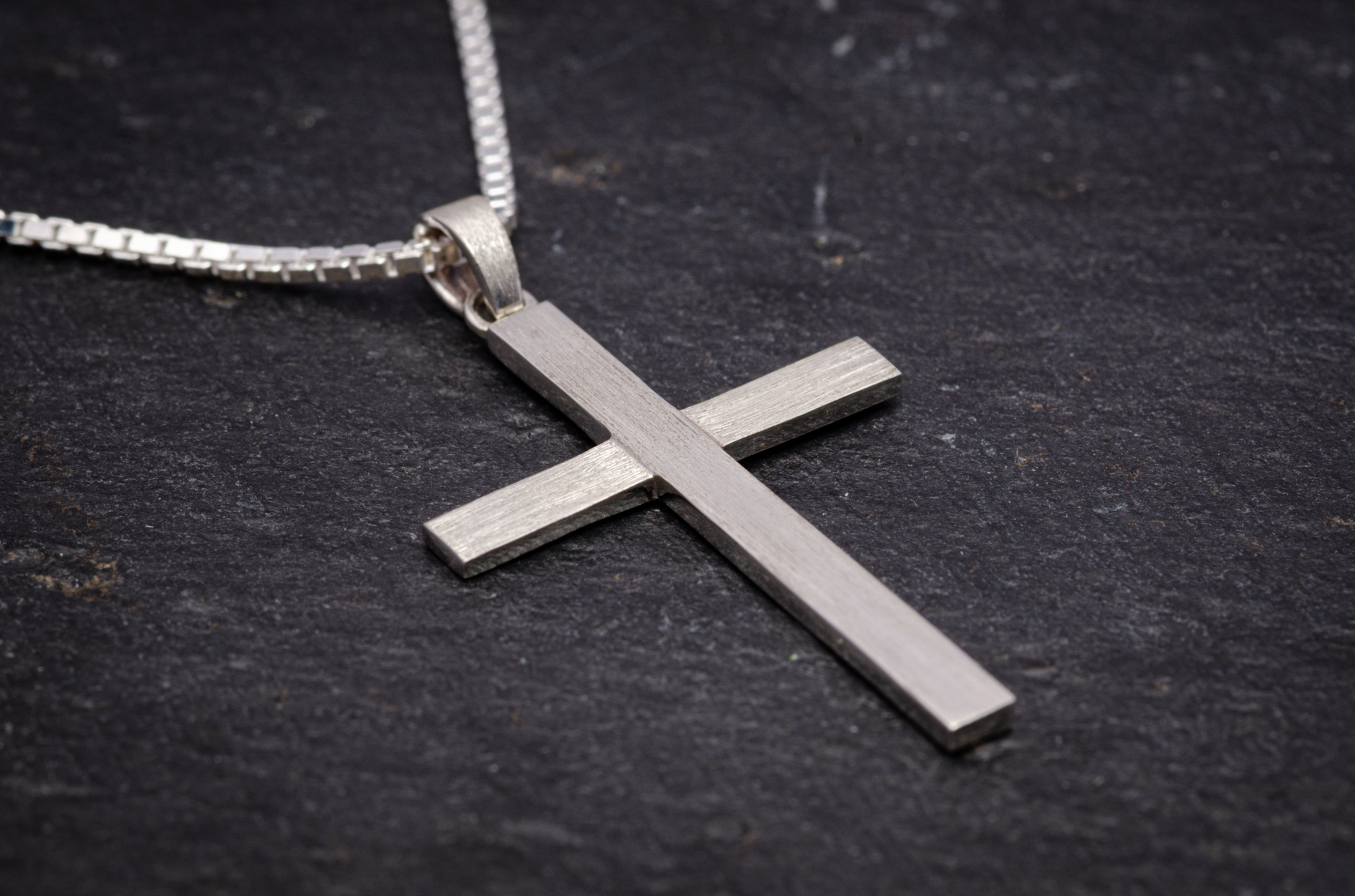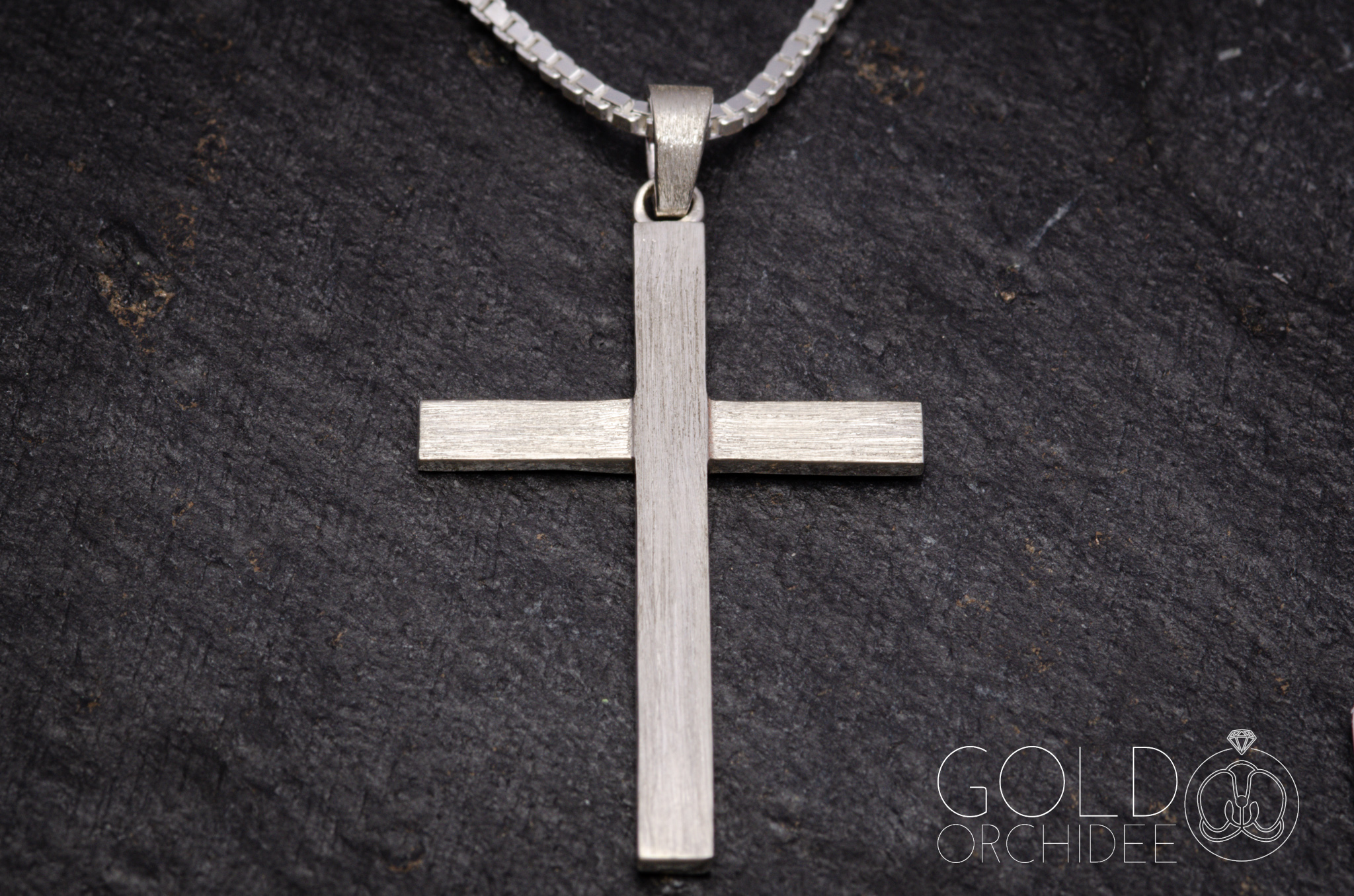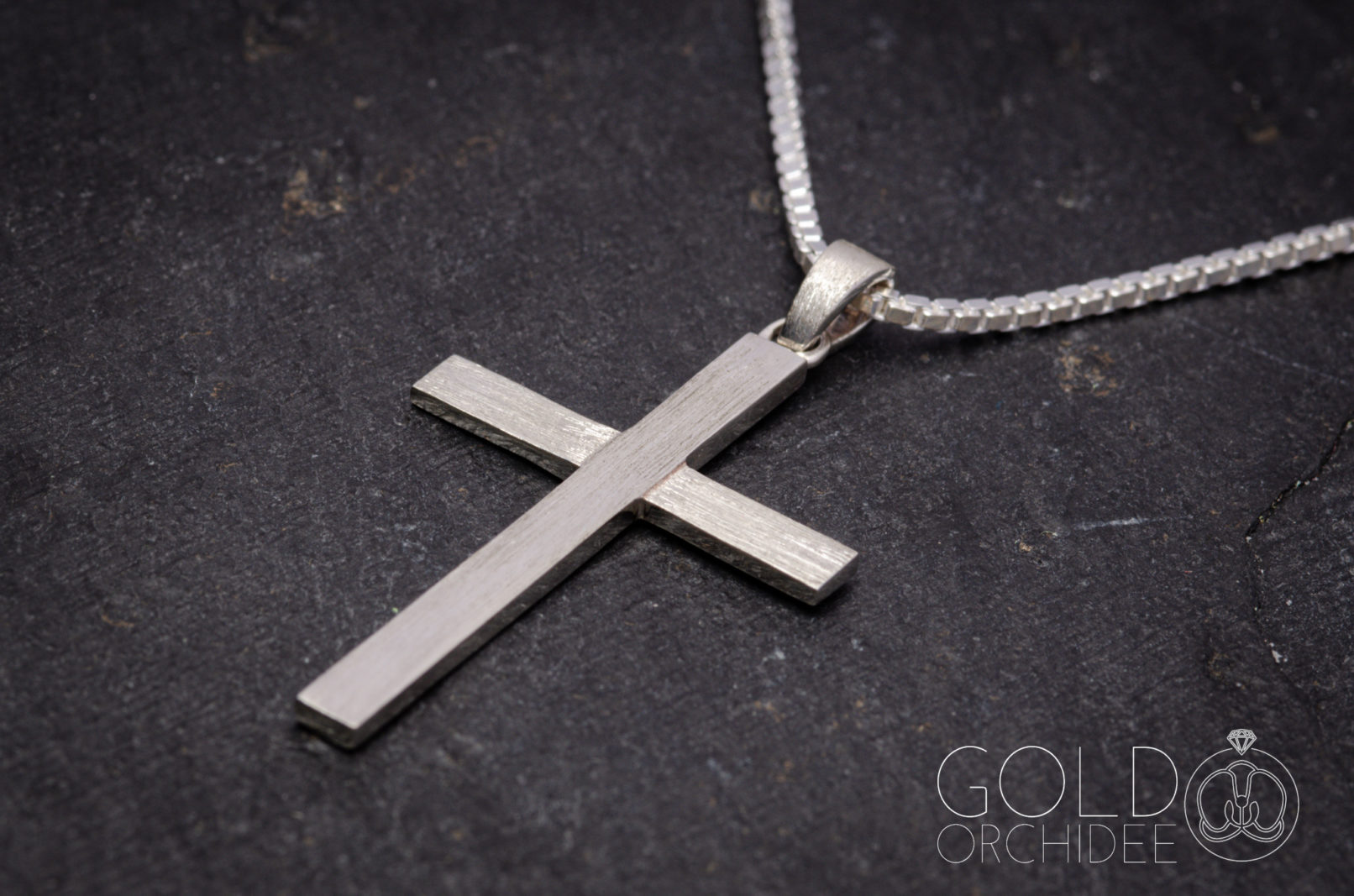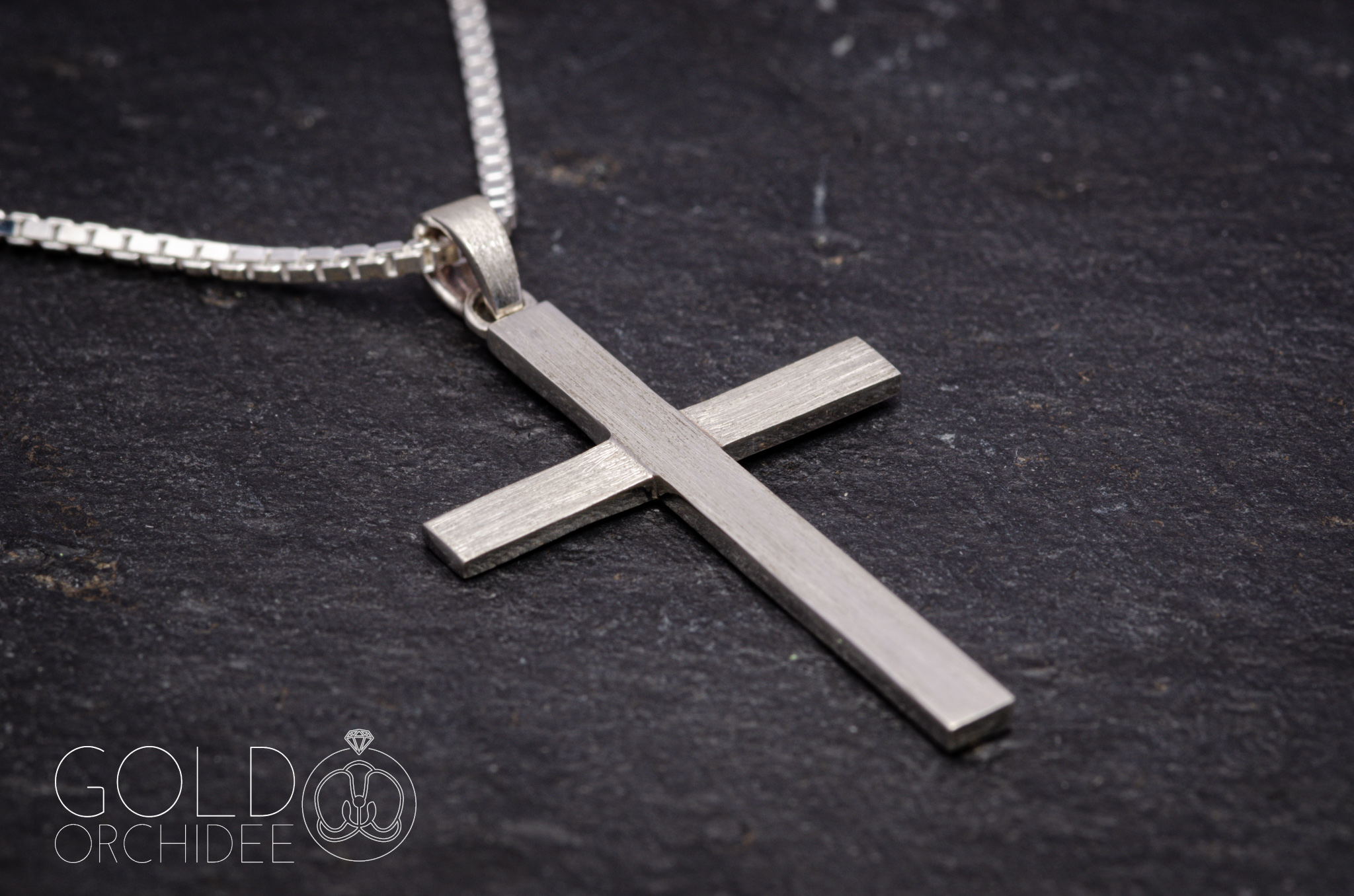 Ein Kreuz mit erhabenem mittleren Balken und darunter ein versetzter Querbalken. Um den Eindruck einer Holzstruktur im Silber zu erzeugen wurde der mittlere Balken mit einer länglichen Struktur mattiert und der Querbalken quer länglich mattiert. Die kleine Schlaufe hat ebenfalls eine längliche Mattierung erhalten, damit diese mit dem Kreuz harmoniert.