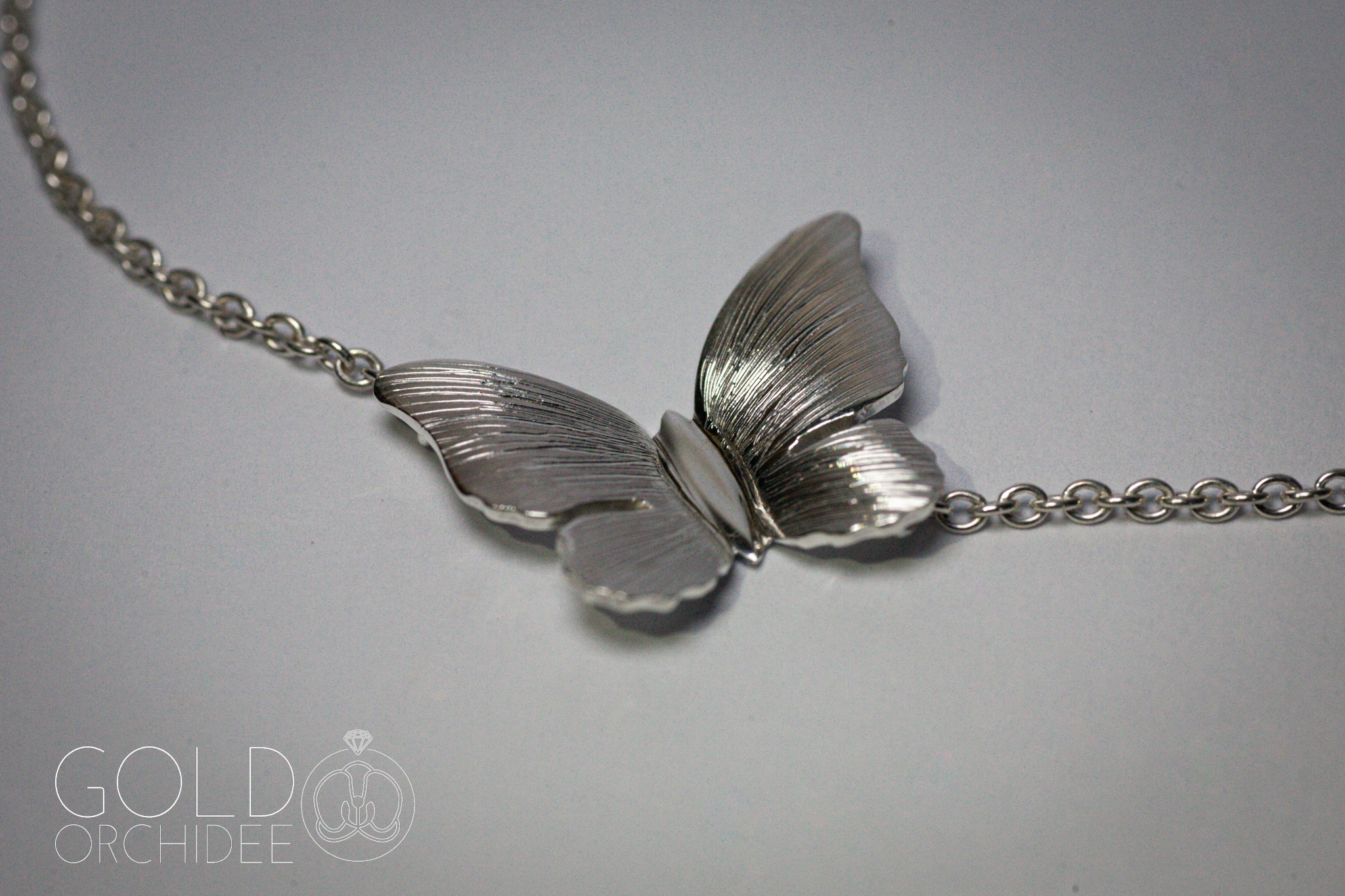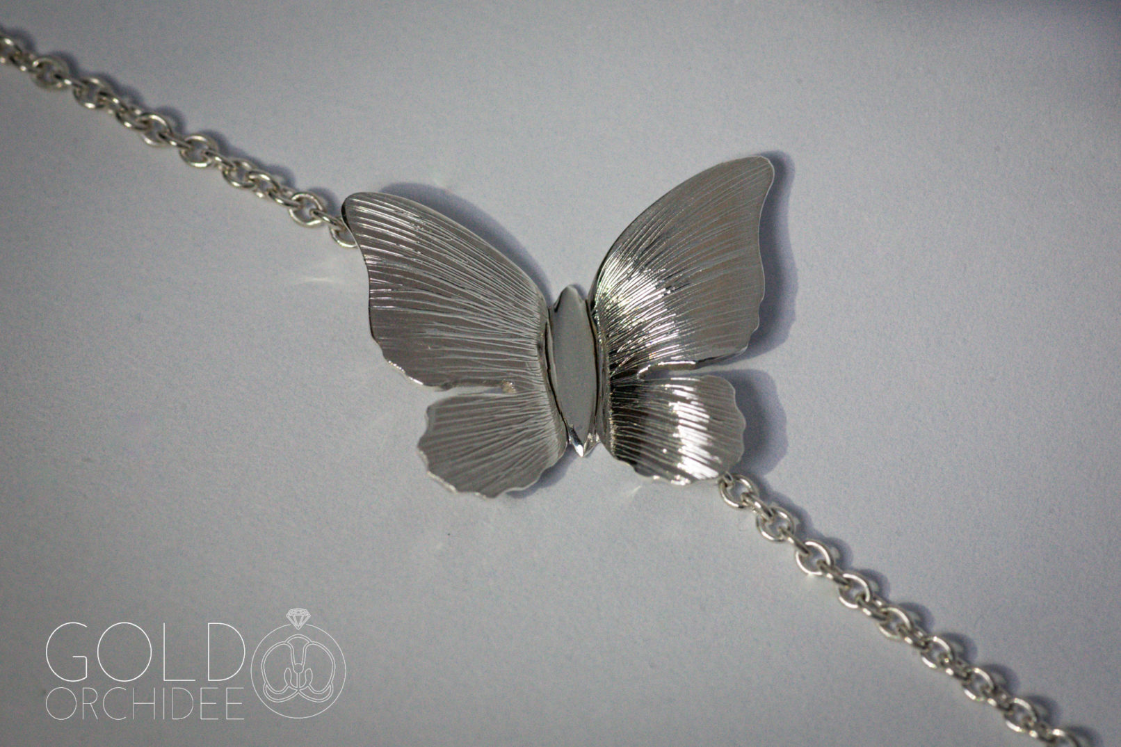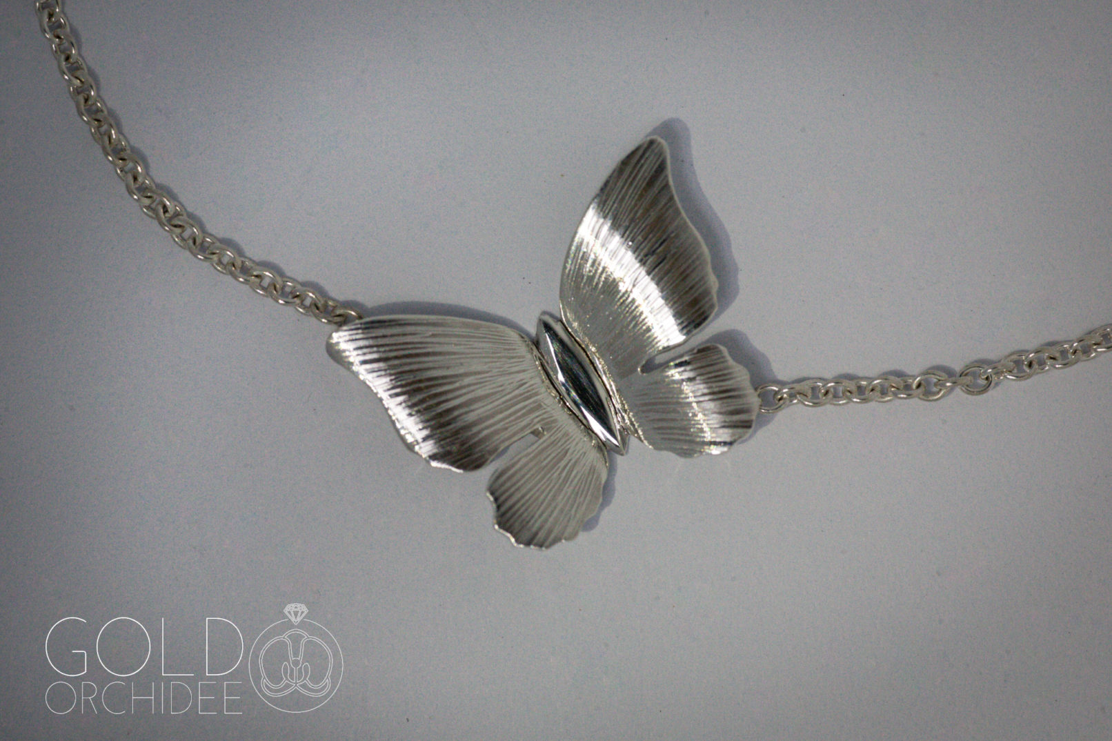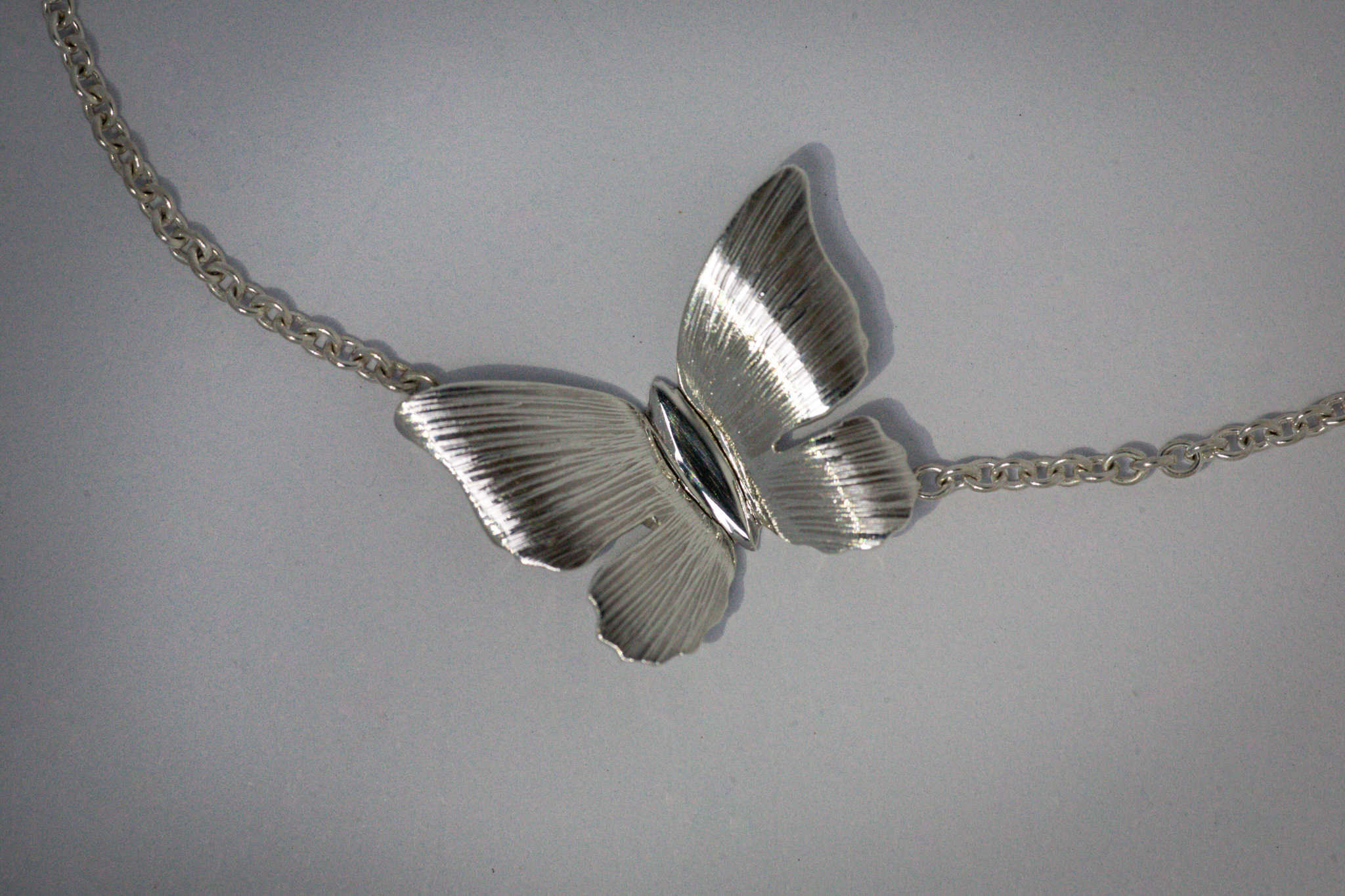 Ein plastisch herausgearbeiteter kleiner Schmetterling an einer Erbs-Collier-Kette in 925/- Silber.