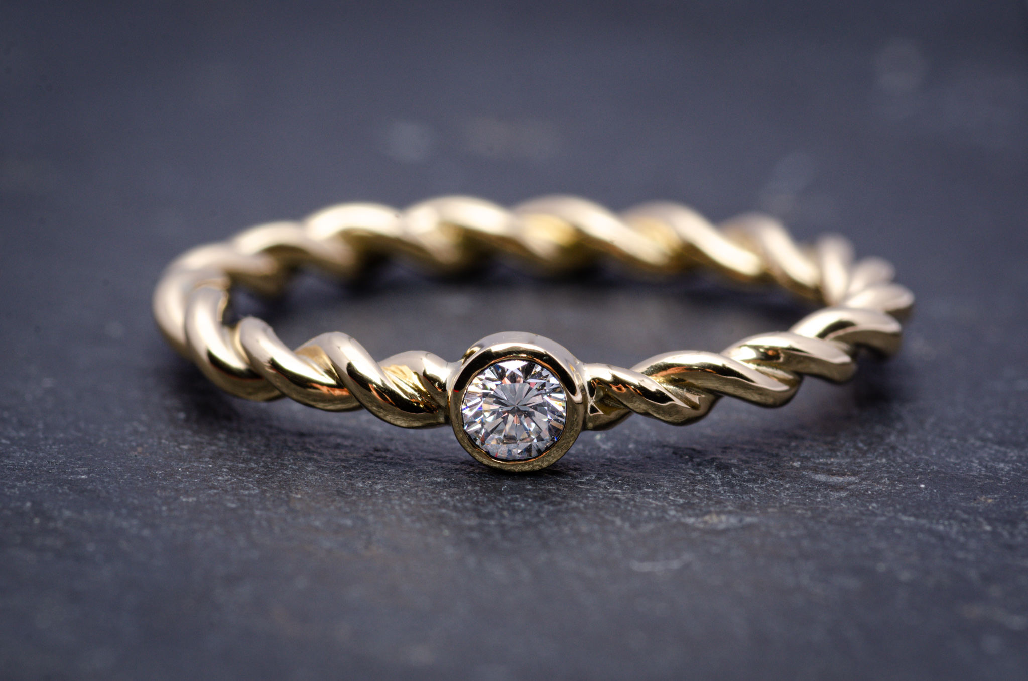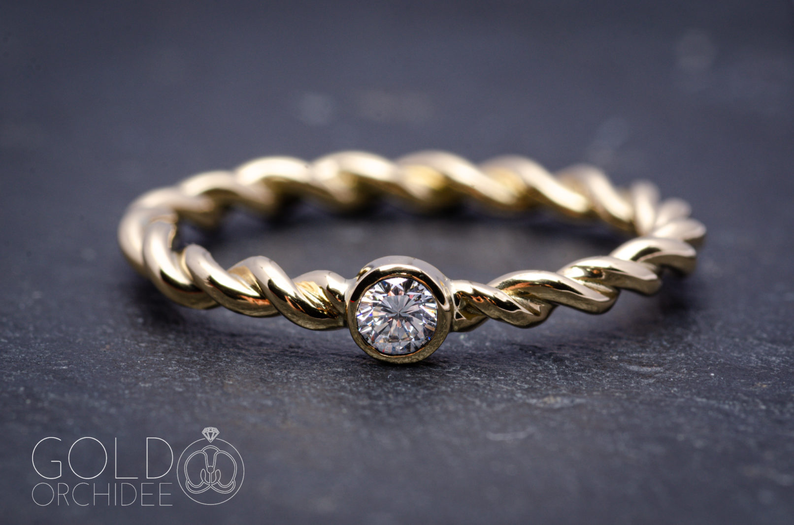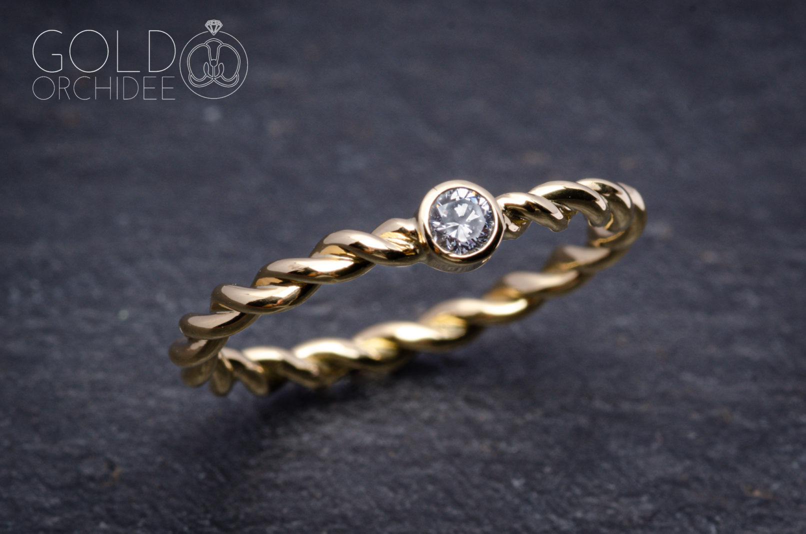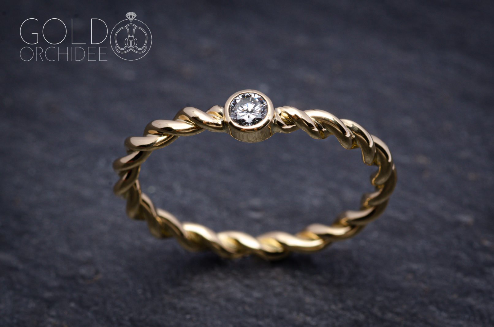 Die Kordel, die hier aus zwei >zusammengedrehten< Gelbgoldsträngen besteht, bildet eine Einheit und symbolisiert die Verbundenheit zwischen zwei Personen. Als Besonderheit liegt zwischen den Kordelenden ein Brillant. Schlicht durch seine reine weiße Farbe, strahlend durch seine Brillanz und besonders durch das Feuer, das Farbspiel welches sich beim Drehen in viele verschiedene bunte Lichtpunkte offenbart. Zusammengefasst ein Verlobungsring.
